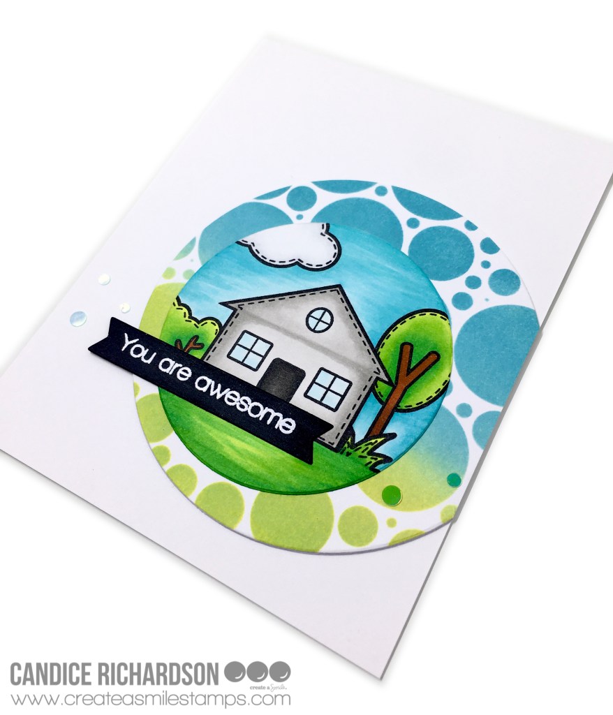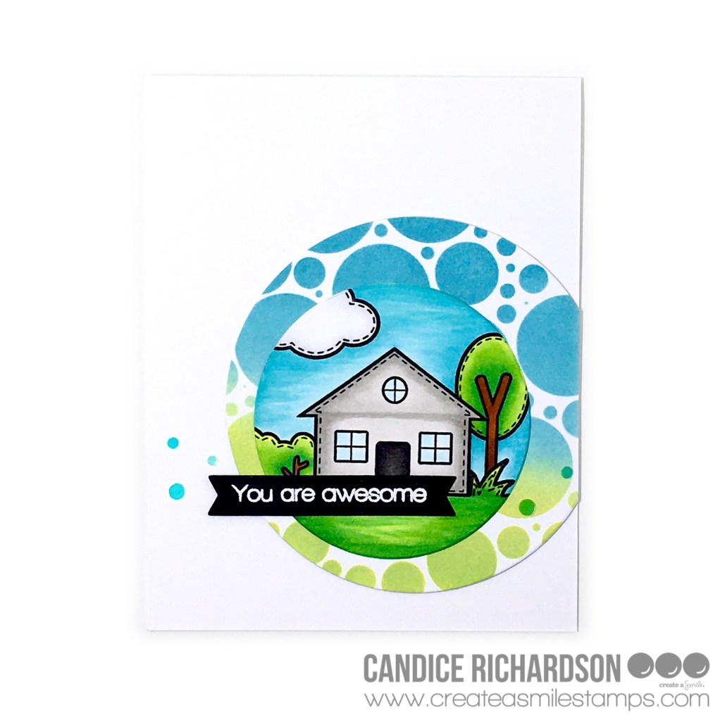 I started by ink blending some distress oxide inks over the Create A Smile (CAS) Bubble Circle stencil. I used Twisted Citron (with a little bit of Mowed Lawn), Tumbled Glass, and Broken China. Once this was done I cut out the section I liked most using a 3.75” Hero Arts Nested Circle die. I cut another circle (2.75” diameter) from 110 lb white cardstock using the same die set. On this circle I stamped my scene in Gina K Designs obsidian black amalgam ink using the CAS Scene Builders stamp. I started by stamping and masking off the house, then I stamped the bushes, grass, tree, and cloud. Once this was done I Copic colored the scene using the colors below.