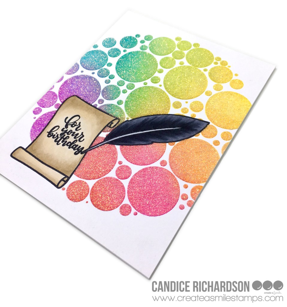I used Pixie Spray on my CAS Bubble Circle stencil and placed it on the card panel. I used my blending brushes and distress inks to blend in a circle: Candied Apple, Picked Raspberry, Spiced Marmalade, Mustard Seed, Twisted Citron, Peacock Feathers, and Wilted Violet. Without removing the stencil I spread Cosmic Shimmer glitter paste over the stencil using a palette knife. I immediately removed and washed the stencil and palette knife, and made sure to remove the masks (very carefully) while the glitter paste was still wet (you could wait until it dries but it may rip the mask/card panel or leave harsh edges).