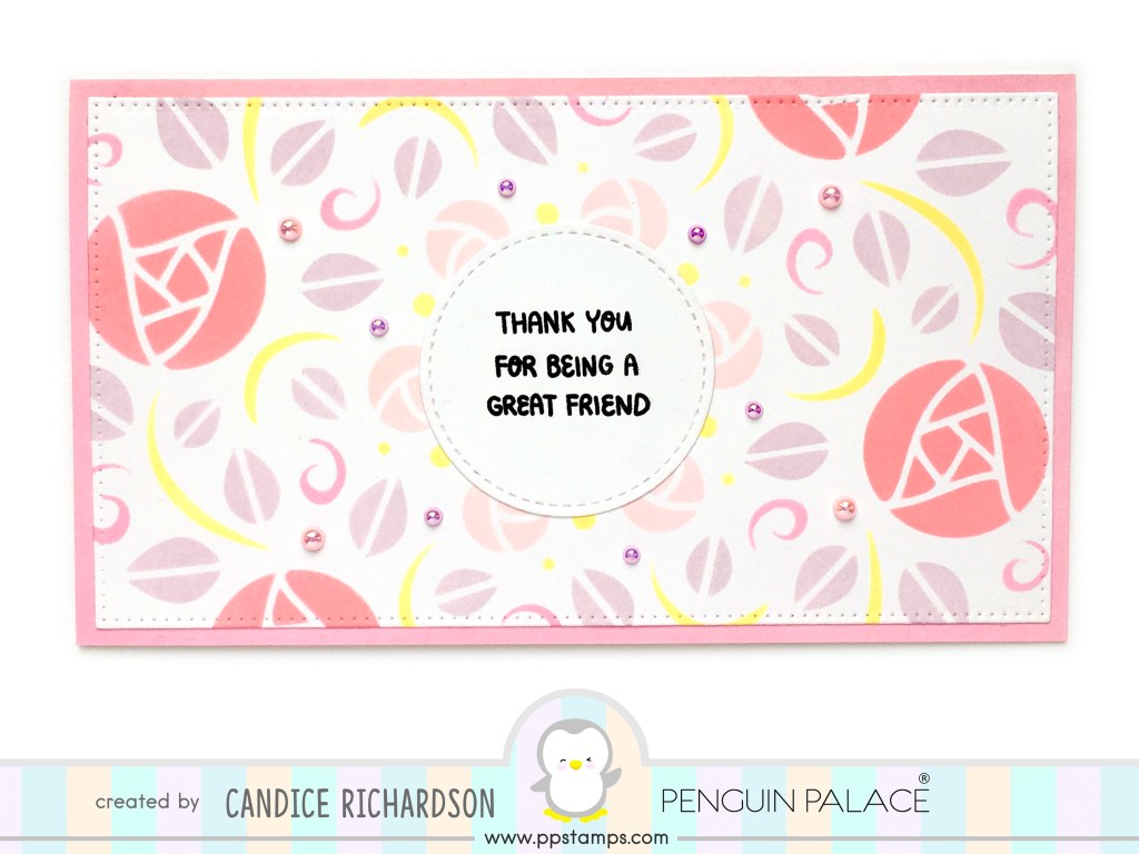 Once the blending was complete, I cut it into a rectangle using one of the dies from the Cinematic Shadow Box Stand Alone Die, and stamped a sentiment from the My BFF stamp set on a die cut circle (it was actually one of the centers I had lying around from a previously cut Lawn Fawn Magic Iris) which was adhered to the center. I mounted the panel on a 6 3/8″ x 3 5/8″ card base and added a few pearl embellishments to finish off the card!