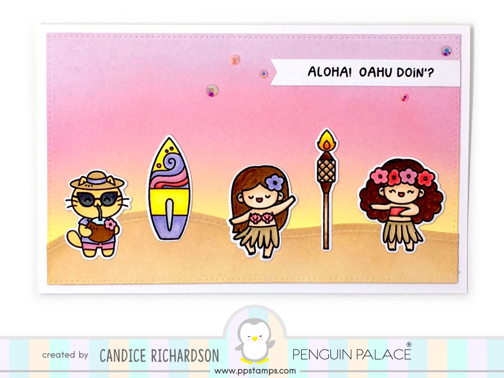 Next, I adhered the images to the front panel and mounted it onto a 6 3/8″ x 4″ card base. Lastly, I paired up the “Aloha” and “Oahu Doin?” sentiments and stamped them onto a banner I created using the Honey Bee Stamps Sentiment Banners. I added a few jewels, and tada, the card is complete!