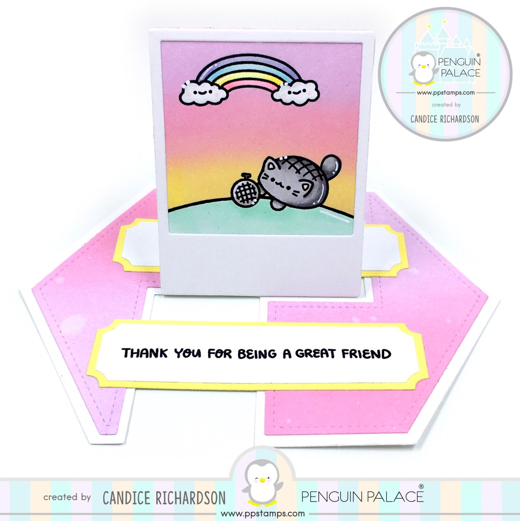 I started by cutting each of the pieces from the Twist-n-Pop Surprise die (1 of the main piece and 2 of each of the others) from white cardstock. I started by creating my two little polaroid scenes by stamping some of the images from the My BFF stamp set using Gina K Designs Obsidian Black amalgam ink on my two die-cut rectangles (making sure to keep the scene inside of where the polaroid frame would cover). I created a mask for each of the images and also masked off the “ground” with a Post-It Note. Next, I ink blended the “sky” using Squeezed Lemonade, Kitsch Flamingo, and Milled Lavender distress oxide inks. I removed my masks and drew in the little hill on each panel with a Copic multiliner.