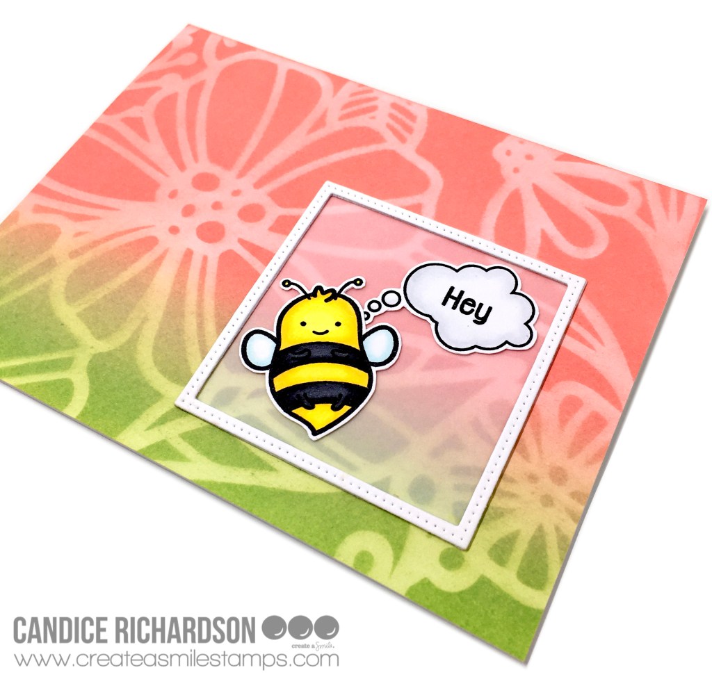 Once the coloring was done, I die cut one of the Stitched Square Frames and cut a small square of vellum to fit just behind. I adhered the vellum and square frame down to the card and then adhered the bee and though bubble on top. Lastly, I mounted the panel on a top folding 4.25 x 5/5″ card base to finish it off!